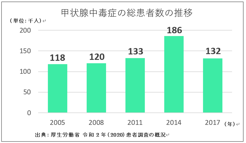 甲状腺ホルモンは、のどぼとけの下にある甲状腺という臓器から分泌されて、血液を通じて心臓や肝臓、腎臓、脳など全身に運ばれ、身体の新陳代謝を調整する働きをしています。そのため、甲状腺が活発化し、甲状腺ホルモンの分泌が過剰になる(甲状腺機能亢進症)と、動悸、頻脈、倦怠感、抜け毛などといった症状が現れ、日常生活や社会生活の質を低下させることが知られています。甲状腺機能亢進症の代表的な疾患にバセドウ病があります。バセドウ病の発生頻度は高く、厚生労働省の調査では2017年のバセドウ病を含む甲状腺中毒症の総罹患数は13.2万人と報告されています。