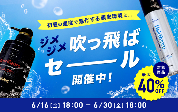 「ジメジメ吹っ飛ばセール」は、暑さで火照った頭部をひんやりとクールダウンする清涼成分のメントールを配合した商品など、梅雨時期に最適な商品をお得にご購入いただけるキャンペーンです。2017年に発売以降、気温の高まりとともに需要が増え、男性をメインに継続的に人気のシャンプー『ヘアリプロ 薬用スカルプシャンプー GIGA OILY(ギガオイリー)』は定価の税抜価格から40%オフで販売します。「ヘアシステム(連続装着商品)」専用の『AD&F アイスシャンプー』などウィッグケア商品もお買い得なキャンペーンです。