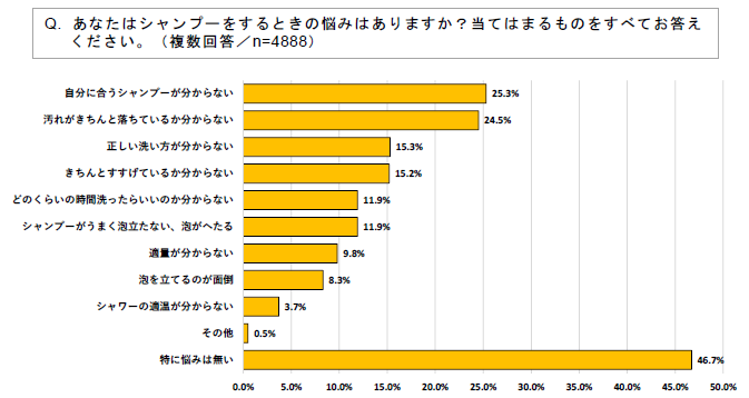 シャンプーをするときの悩みについて尋ねたところ、53.3%はいずれかの悩みの項目を回答しており、半数以上の方がシャンプーに悩みを感じていることが分かります。各悩みの項目では、「自分に合うシャンプーが分からない」が25.3%でトップとなり、次いで「汚れがきちんと落ちているか分からない」(24.5%)が僅差で2位となりました。泡に関する項目については、「シャンプーがうまく泡立たない、泡がへたる」が11.9%、「泡を立てるのが面倒」が8.3%となり、泡に関する悩みを感じている方は一定数いることが分かります。