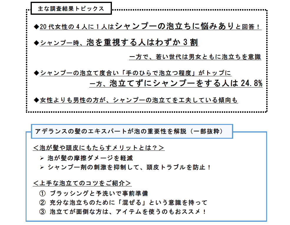 毛髪・美容・健康のウェルネス事業をグローバル展開する株式会社アデランス(本社:東京都品川区、代表取締役社長 津村 佳宏)では、47都道府県各104人(20~60代の男女 計4888人)を対象に、シャンプーの“泡”に関する意識調査をインターネット調査で実施しました。