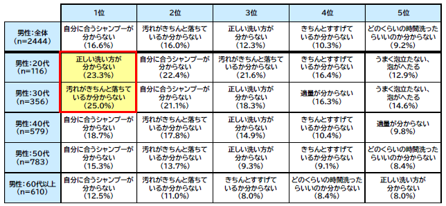 男性においては、40代以上では「自分に合うシャンプーが分からない」がトップとなりましたが、20代男性では「正しい洗い方が分からない」、30代男性では「汚れがきちんと落ちているか分からない」がトップとなりました。比較的若い世代では、洗い方や汚れ落ちに対する悩みが多い一方、40代以降ではシャンプー選びに関する悩みを抱えている様子が垣間見えます。