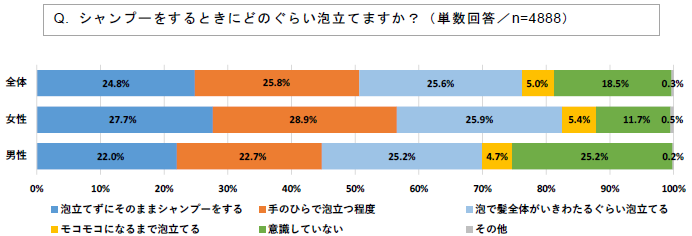 一方で「泡立てずにそのままシャンプーをする」(24.8%)、「意識していない」(18.5%)と回答した方も多く、泡の重要性に対する意識は個人によって異なることが分かります。男女別では「意識していない」と答えた方の割合に差が出ており、女性(11.7%)よりも男性(25.2%)の方が、あまり泡を気にしていない傾向が表れています。