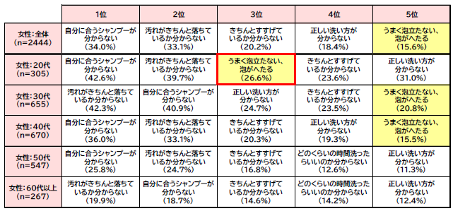 ただ、20代女性については特徴的な傾向が表れており、「シャンプーがうまく泡立たない、泡がへたる」と回答した人の割合が、26.6%で3位に入りました。20代女性の約4人に1人は泡に関して悩みを感じていることが分かりました。