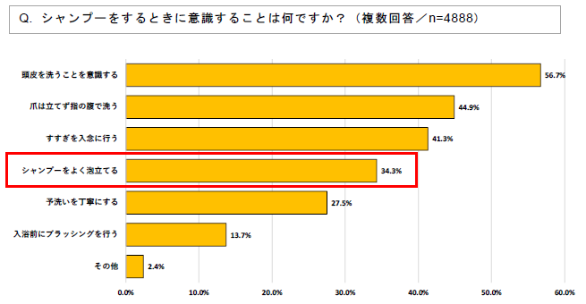 シャンプーをするときに意識することを尋ねたところ、「頭皮を洗うことを意識する」が56.7%でトップとなりました。次いで「爪は立てず指の腹で洗う」(44.9%)、「すすぎを入念に行う」(41.3%)と続きました。「シャンプーをよく泡立てる」は34.3%で、シャンプー時に泡を意識している人は約3割程度に留まる結果となりました。