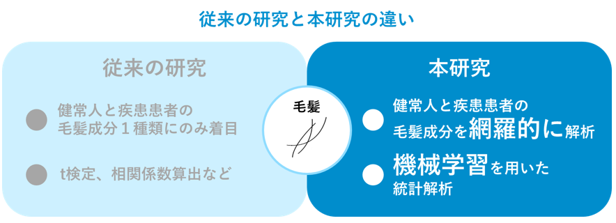 毛髪は、血液を介して体内の栄養素を取り込みながら細胞が固定化・線維化されて1ヶ月に1cmほど伸長します。また、毛髪にはタンパク質をはじめ、ミネラルやアミノ酸など数多くの成分が含まれています。このような性質から毛髪は、血液や尿よりも安定的に数多くの健康データを取得できる生体試料として近年注目を集めており、研究分野においても毛髪成分を解析することで疾患を判別する研究が盛んに行われています。しかし、ほとんどの研究では、毛髪に含まれる数多くの成分から1種類の成分に着目して、疾患との関連性を調べる解析手法が用いられています。そこで本研究は、機械学習を用いて毛髪に含まれる数多くの成分を多変量的に解析し、疾患との関連性を調べることで、健康指標としての毛髪の新たな可能性を