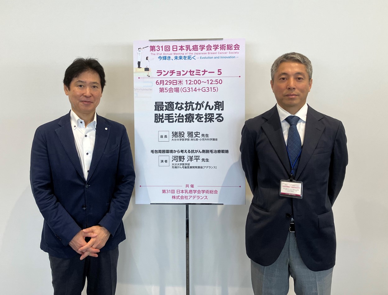 会期中の6月29日(木)にアデランス共催のセミナーが実施され、大分大学医学部 先端がん毛髪医療開発講座[アデランス] 准教授の河野 洋平先生が講演し、大分大学医学部 消化器・小児外科学講座 教授の猪股 雅史先生が座長を務めました。