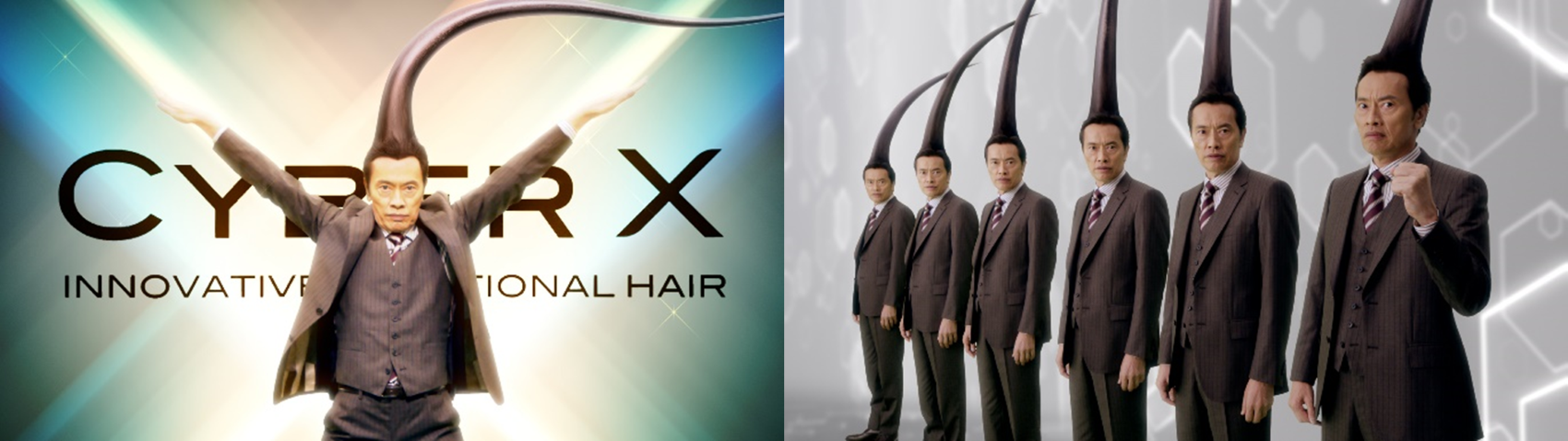 11月13日(月)から放映を開始する新CMでは遠藤憲一さんが、太く長い毛髪が生えた「サイバーエックスマン」に変身し、当社の機能性人工毛『サイバーエックス』の最大の特長であるハリ・コシを全身で体現しています。「サイバーエックスマン」になりきった遠藤さんが、“X(エックス)”のポーズを格好よく決めたり、髪が増えるイメージで増殖したりと、キャッチーでパワフルなCMになっています。