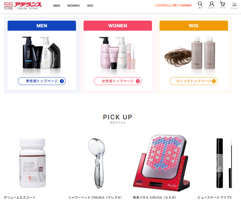 アデランス公式通販サイトは 2010 年に開設し、現在は当社の事業・商品展開の広がりにより、ウィッグのみならず、コスメやヘアドライヤー、健康補助食品サプリメントなどトータルビューティをサポートする商品を多数取り扱っており、性別問わず、幅広いご年齢のお客様にご愛顧いただいております。