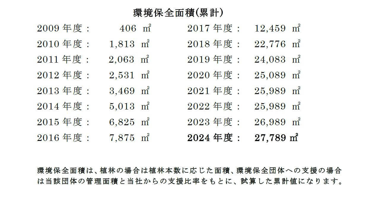 2009年の植樹開始から15年で環境保全面積は累計で27,789㎡(東京ドーム半分以上の面積)となり、活動の範囲も年々広がっています。