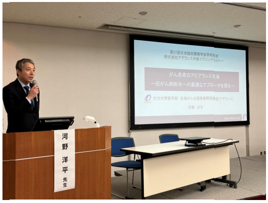 第21回を迎える今回の学術総会は、「Break the Borders and Beyond ~for our patients~」をテーマに開催され、約4,700名の方がご来場になり、海外からは34か国・約550名の方が参加されました。会期中の2月22日(木)にアデランス共催のセミナーを実施し、大分大学医学部 先端がん毛髪医療開発講座[アデランス] 准教授の河野 洋平先生が講演し、大分大学医学部長 大分大学医学部 消化器・小児外科学講座 教授の猪股 雅史先生が司会を務めました。