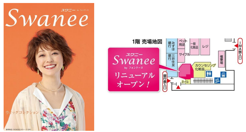 「スワニー by フォンテーヌ」は、「ウィッグのある生活」をテーマに大手流通チェーン様に展開しており、ウィッグをファッションとして身近に楽しんでいただけるブランドです。地域の方々に、日々のお買い物の際などに気軽に立ち寄っていただけるアットホームな売場が魅力です。この度、「スワニー by フォンテーヌ イオン練馬店」は、フロアは変わらず 1 階のまま、「カウンセリング化粧品コーナー」に移転し、装いを新たに生まれ変わります。新たな売場には個室を1席、オープンドレッサー1席を完備し、これまで以上に試着もご相談も、ゆっくりとくつろぎながらお過ごしいただけます。