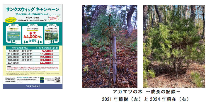 本キャンペーンでは、全国のフォンテーヌ店舗(一部店舗を除く)などに、お客様が使われなくなったウィッグ(他社商品を含む)を店頭にお持ち込みいただいた際に、「サンクス クーポン券」を進呈いたします。このクーポン券を利用して新たにフォンテーヌ商品(ウィッグ)をご購入いただくと割引価格が適用されることに加え、お買い上げ商品1点につき100円を環境コミュニケーションを推進する合同会社ツバルの森(本社:東京都渋谷区、代表社員:三嶋 浩太)を通じて、植林活動に活用します。これまで、本キャンペーンでの拠出金は、山梨県での植樹を皮切りに、東日本大震災被災エリアでの桜の植樹、東日本大震災の間接被害を受けた静岡県立森林公園でのアカマツ林の植樹活動の資金として活用してまいりました。