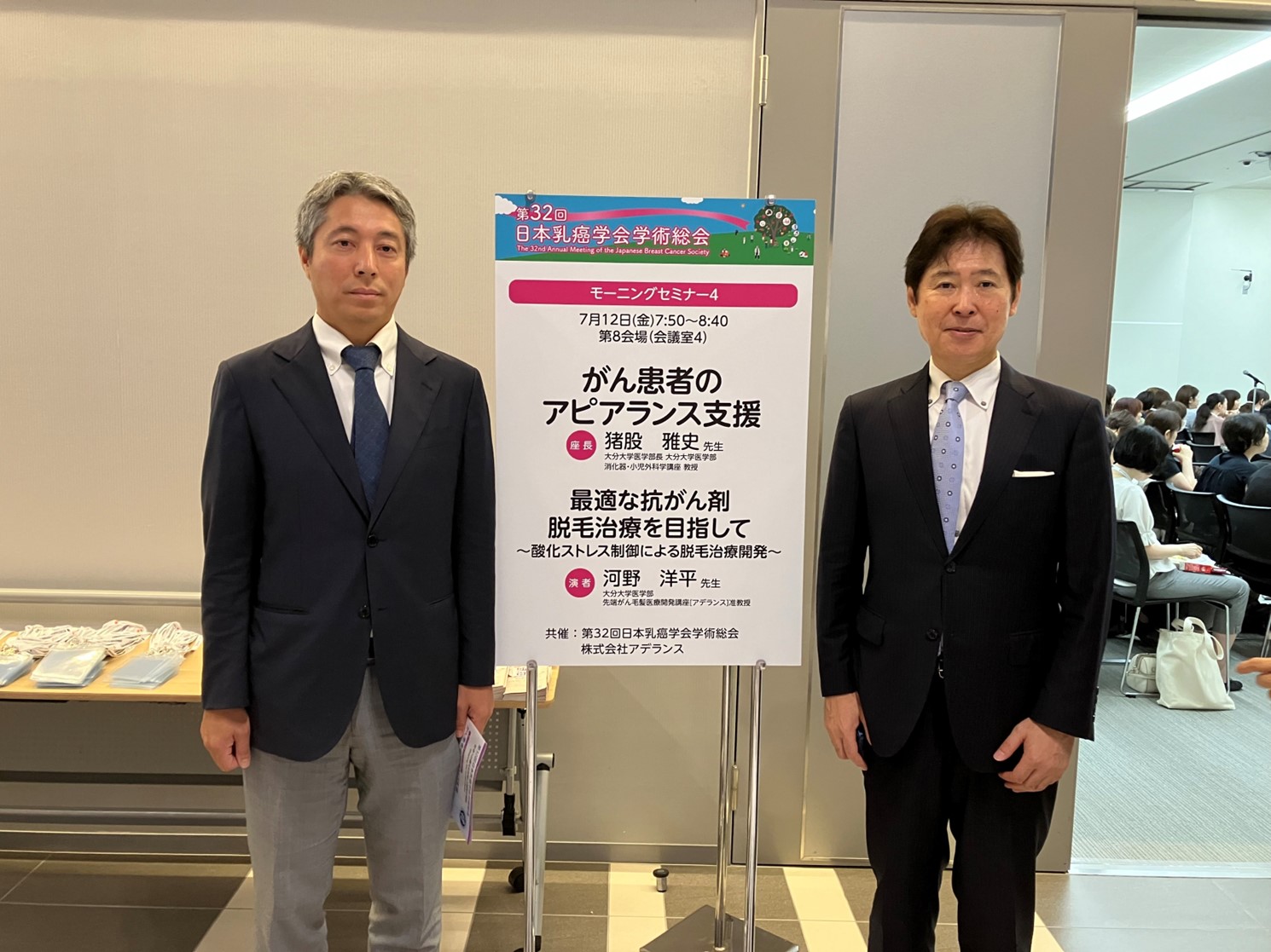 会期中の7月12日(金)にアデランス共催のセミナーが実施され、大分大学医学部 先端がん毛髪医療開発講座[アデランス] 准教授の河野 洋平先生が講演し、大分大学医学部長 消化器・小児外科学講座 教授の猪股 雅史先生が座長を務めました。