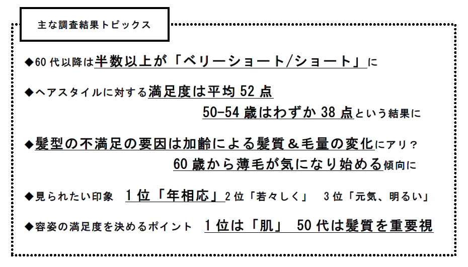 当社では創業以来、髪の専門家として髪のお悩みを抱えているお客様をサポートしてきました。今回は、“髪型”をテーマに年代別の現在の髪型や髪質に対する満足度、不満などを調査しました。また、髪型以外に求める容姿の理想像についても調査結果をレポートします。