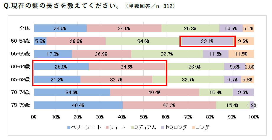 また、全体では「セミロング」と回答した方はわずか10.6%でしたが、50-54歳のみ23.1%と他の年代と比較しても2倍以上多いことも特徴的な結果となりました。