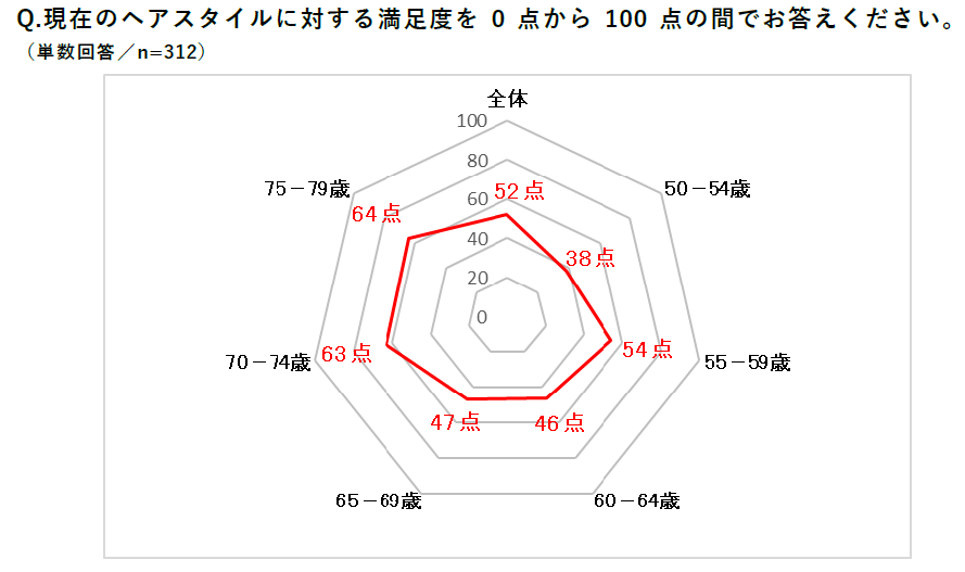 現在のヘアスタイルに対して点数をつけていただいたたところ、全体の平均は52点となりました。50-54歳の平均は38点と、他の年代と比較しても満足していない方が多いことが分かります。一方で70代は60点を超えており、50代や60代に比べるとヘアスタイルに満足している方が多いことが分かります。