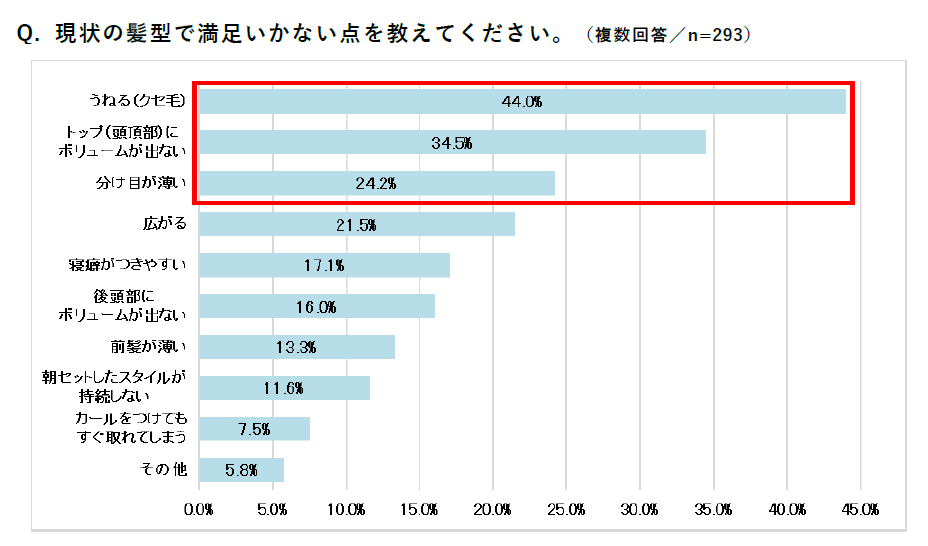 前問でヘアスタイルに対する満足度を100点と回答した方以外に、現状の髪型で満足いかない点を尋ねたところ、「うねる」(44.0%)が最も多い回答となり、次いで「トップにボリュームが出ない」(34.5%)、「分け目が薄い」(24.2%)が続きました。