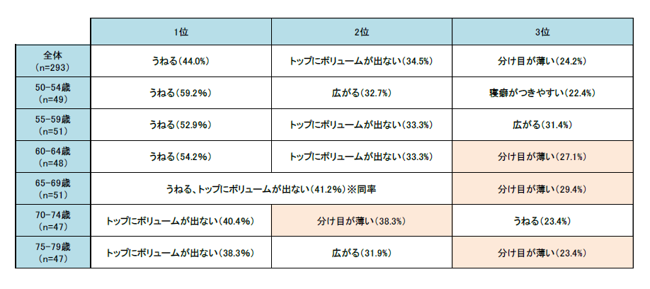 年代別で見ると、50-64歳までは「うねる」が1位ですが、65-69歳で「うねる」と「トップにボリュームが出ない」が同率1位で境目となり、70歳以降は「トップにボリュームが出ない」が逆転して1位となりました。