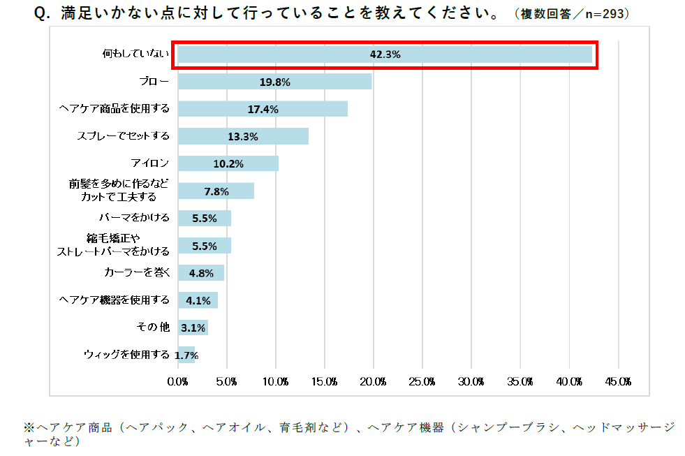 また、満足いかない点に対して行っていることを尋ねたところ、何もしていない(42.3%)が最も多い回答となり、満足をしていなくても対処をしていない方が多いことが分かります。対処をしている方では、「ブロー」(19.8%)、「ヘアケア商品を使用する」(17.4%)、「スプレーでセットする」(13.3%)が上位となりました。
