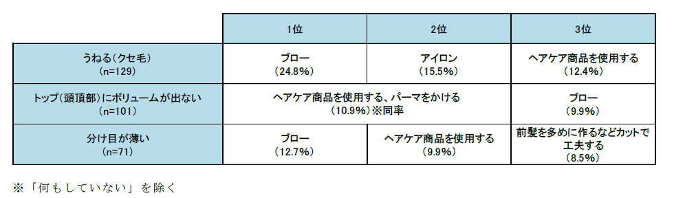 現状の髪型で満足いかない点で上位3位であった「うねる」「トップにボリュームが出ない」「分け目が薄い」に対しては、「うねる」ではアイロン(15.5%)、「トップにボリュームが出ない」ではパーマ(10.9%)、「分け目が薄い」では前髪を多めに作るなどカットで工夫する(8.5%)など、お悩みに沿った対処をしていることが分かりました。