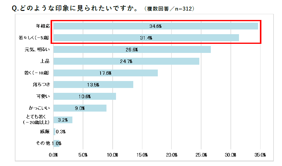 どのような印象に見られたいか尋ねたところ、「年相応」(34.6%)、「若々しく」(31.4%)が上位となり、印象では年齢を重視している方が多いことが分かりました。次いで、「元気、明るい」(26.6%)、「上品」(24.7%)といった雰囲気に関する印象が続きました。