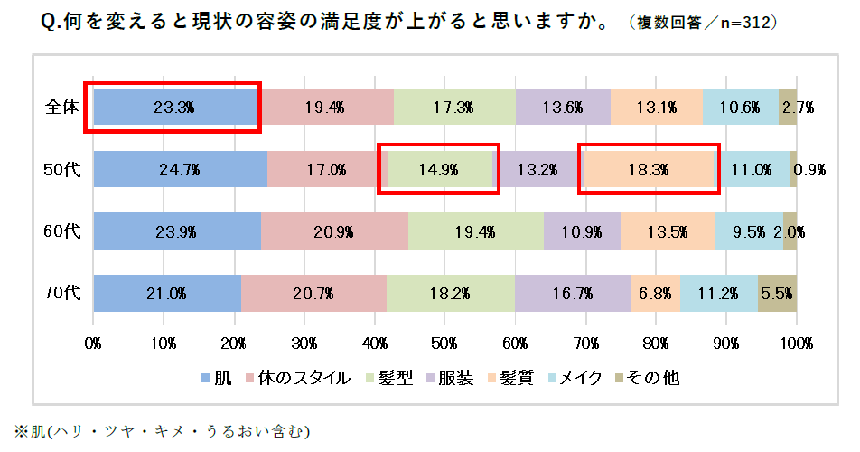 何を変えると現状の容姿の満足度が上がるか尋ねたところ、全体では、肌(23.3%)が最も多い回答となり、次いで体のスタイル(19.4%)、髪型(17.3%)が続きました。