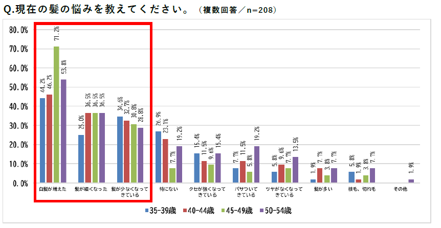 現在の髪の悩みを尋ねたところ、全年代で「白髪が増えた」が最も多い回答となりました。「白髪が増えた」と回答した方は、35-44歳は半数以下でしたが、45-54歳では半数を超え、45歳を境に2人に1人以上が白髪に悩んでいる様子がうかがえます。