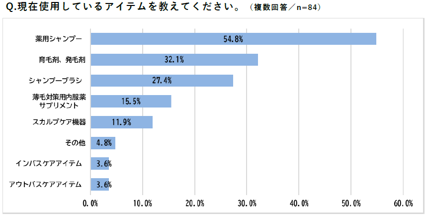 現在使用しているアイテムを尋ねたところ、ニオイやフケを予防する「薬用シャンプー」(54.8%)が最も多い回答となりました。次いで「育毛剤、発毛剤」(32.1%)、「シャンプーブラシ」(27.4%)が続きました。