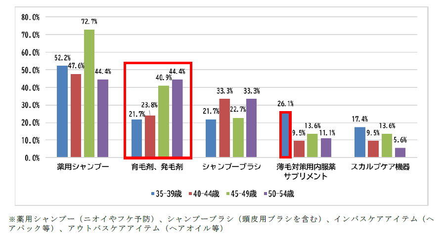 上位5位を年代別に見ると、「育毛剤、発毛剤」と回答した方が35-39歳は21.7%であったのに対して45-49歳では40.9%となっており、45歳を境に使用率が増加していることが分かります。また、35-39歳のみ「薄毛対策用内服薬、サプリメント」と回答した方が他の年代より多く、インナーケアにも重点を置いている様子がうかがえます。