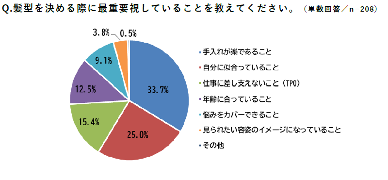 髪型を決める際に最重要視していることを尋ねたところ、「手入れが楽であること」(33.7%)が最も多い回答となりました。次いで、「自分に似合っていること」(25.0%)、「仕事に差し支えないこと」(15.4%)、「年齢に合っていること」(12.5%)が続きました。