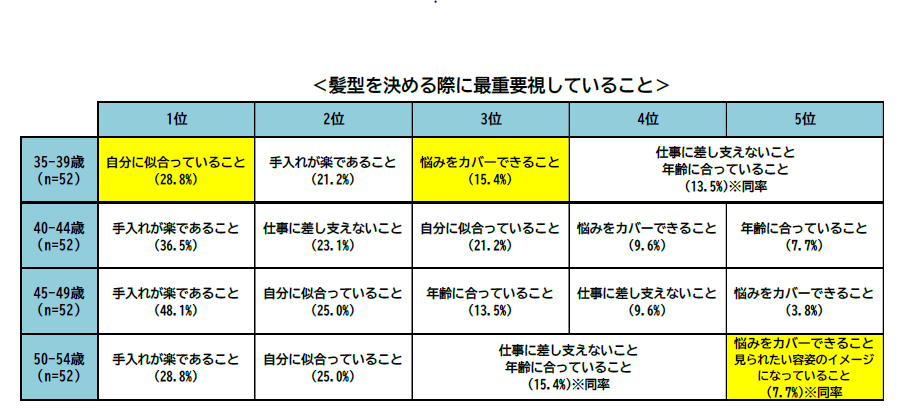 上位5位を年齢別に見ると、40-54歳は「手入れが楽であること」が1位であるのに対して、35-39歳のみ「自分に似合っていること」(28.8%)が最も多い回答となりました。「悩みをカバーできること」(15.4%)が3位であることからも、35-39歳は手軽さより見た目を重要視している方が他の年代よりも多いことが分かります。