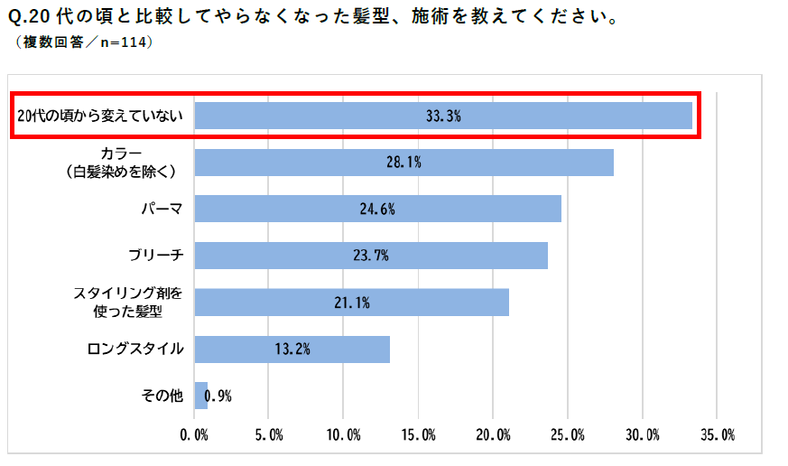 20代の頃と比較してやらなくなった髪型、施術を尋ねたところ、「20代の頃から変えていない」(33.3%)が最も多い回答となり、ミドルエイジ男性の約3人に1人が、20代にしていた髪型を現在まで継続していることが分かりました。次いで、「カラー」(28.1%)、「パーマ」(24.6%)、「ブリーチ」(23.7%)が続きました。