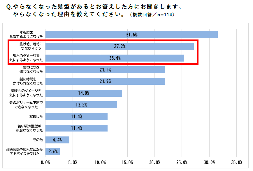 続いて、髪型についてやらなくなった理由を尋ねたところ、「年相応を意識するようになった」(31.6%)が最も多い回答となり、次いで、「抜け毛、薄毛につながりそう」(27.2%)、「髪へのダメージを気にするようになった」(25.4%)が続きました。前問で「カラー」、「パーマ」、「ブリーチ」が上位にランクインしていることから、「抜け毛、薄毛、ダメージ」を避けるため、これらの施術をやらなくなる傾向が読み取れます。