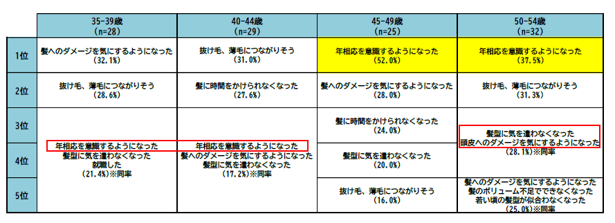 また、上位5位を年代別に見ると、35-44歳は「年相応を意識するようになった」が3位であるのに対して、45-54歳では1位であることから、45歳以降は年齢を意識した髪型を選んでいることが分かります。さらに、50-54歳のみ、「髪のボリューム不足でできなくなった」、「若い頃の髪型が似合わなくなった」がランクインしており、希望の髪型があってもできなくなってしまうケースもあるようです。