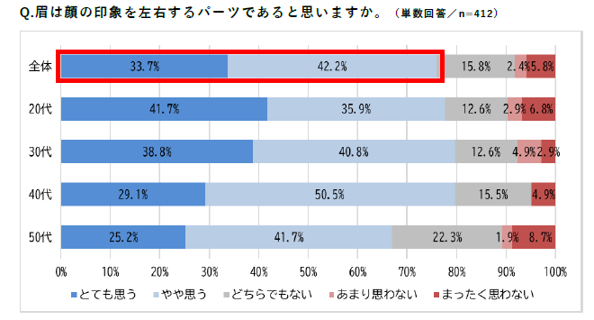 眉は顔の印象を左右するパーツであるか尋ねたところ、全体の7割以上の方が印象を左右すると思うと回答しました。世代別で見ると、20代から40代では8割近く、50代でも7割近くの方が回答していることから、全世代で眉が顔の重要なパーツであると認識しているようです。