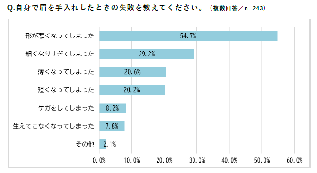 次いで、「細くなりすぎてしまった」(29.2%)、「薄くなってしまった」(20.6%)、「短くなってしまった」(20.2%)が続き、細かさや慎重さが必要とされる眉の手入れを難しいと感じている方が多い様子がうかがえます。