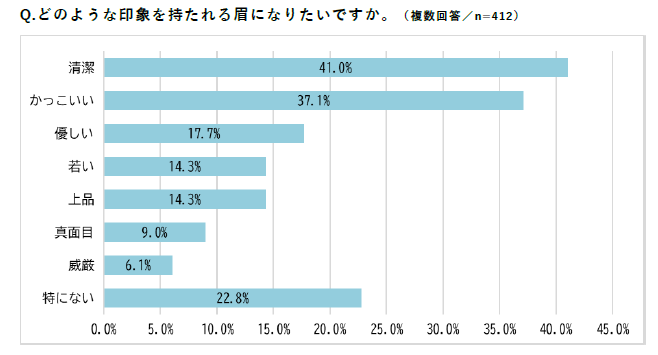どのような印象を持たれる眉になりたいか尋ねたところ、「清潔」(41.0%)が最も多い回答となり、“清潔さが感じられる眉”が身だしなみの一部として重要視されていることが分かります。また、次いで「かっこいい」(37.1%)が続きました。