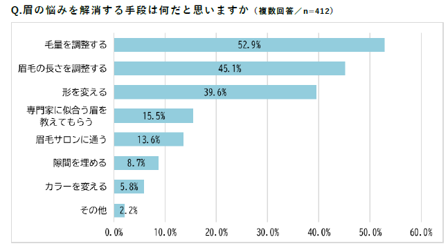 眉の悩みを解消する手段を尋ねたところ、半数以上が「毛量を調整する」と回答しました。眉が濃い場合は薄く、薄い場合はボリュームを出すなど、毛量を調整することで理想の眉に近づくと考えていることが分かります。