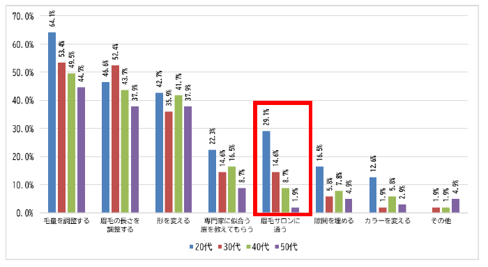 年代別に見ると、20代の約3人に1人が眉の悩みを解消する手段として「眉毛サロンに通う」と回答しており、昨今の男性の美容意識の高まりから、若年層の男性には眉毛サロンも一般的になってきているのかもしれません。