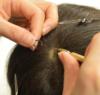 - ウィッグから毛が抜けてしまい、毛の量が少なくなってしまった場合などに行うのが「毛植え」です。アデランスでは熟練の職人が、ひとつひとつ手作業で丁寧に植えていきます。